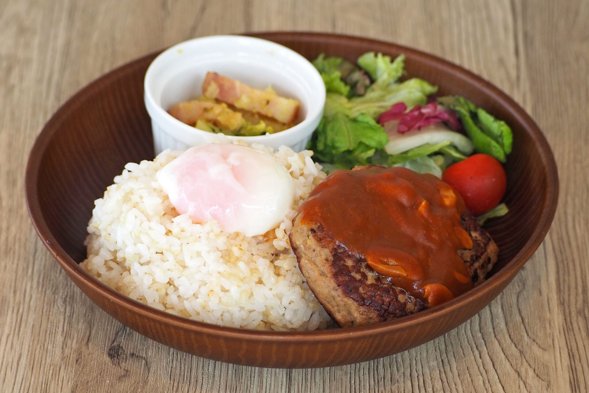 肉汁あふれるハンバーグを玄米ごはんの上にのせて、黄身がとろっと流れる玉子とデミグラスソースをトッピングしました。