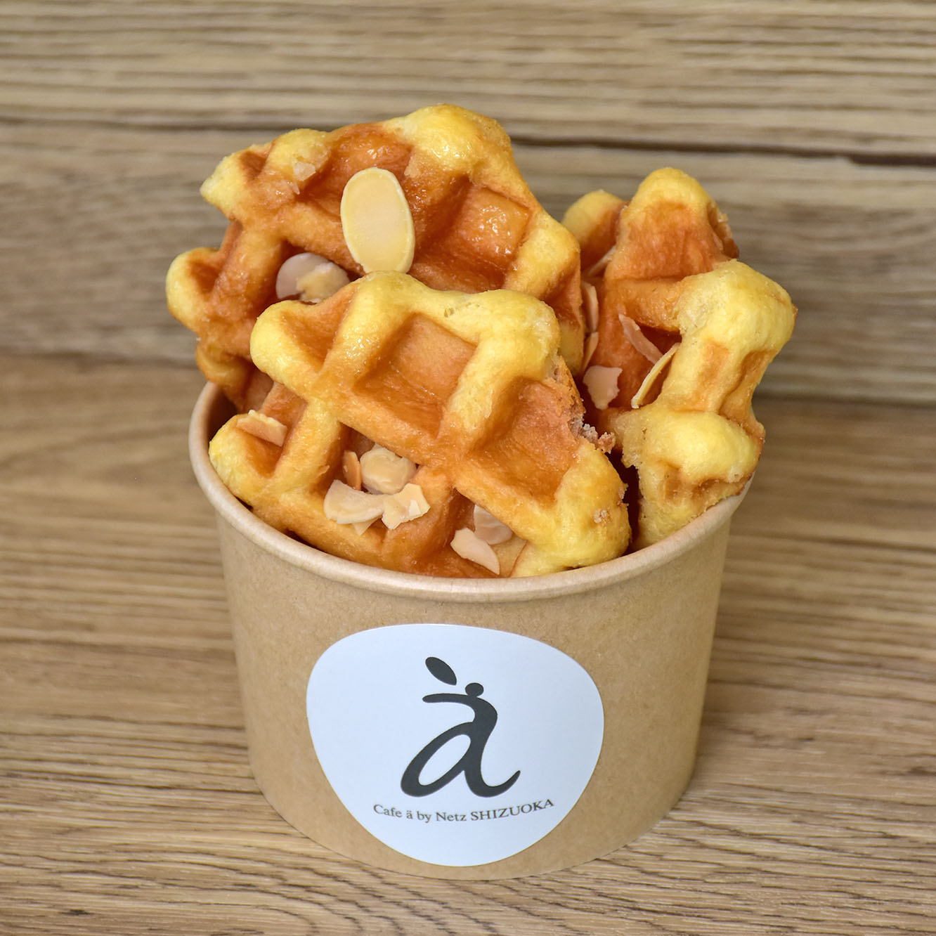 焼きたてのワッフルにアーモンドをトッピング。香ばしさとサクサク食感を楽しめます。