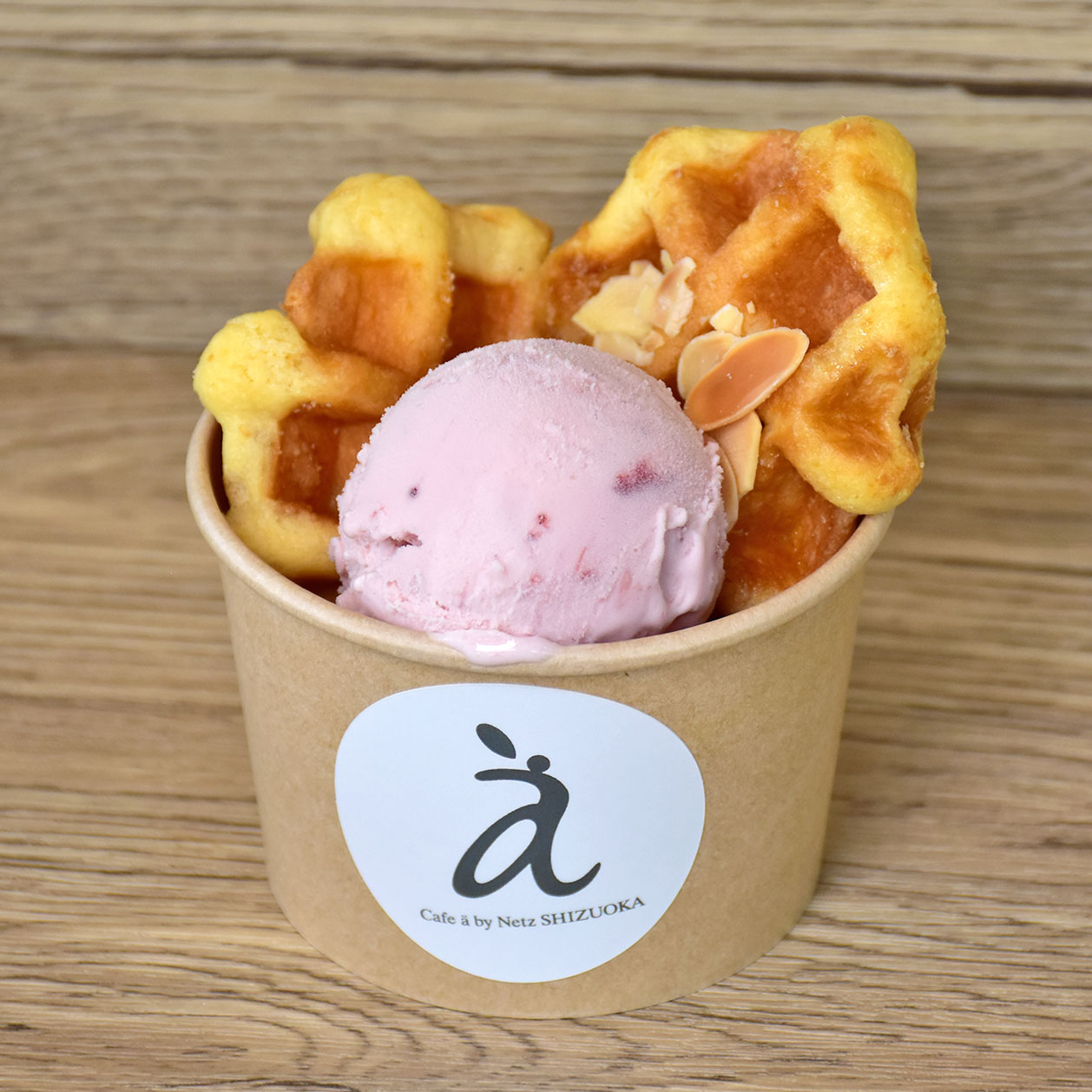 焼きたてのワッフルにアーモンドをトッピング。香ばしさとサクサク食感を楽しめます。
