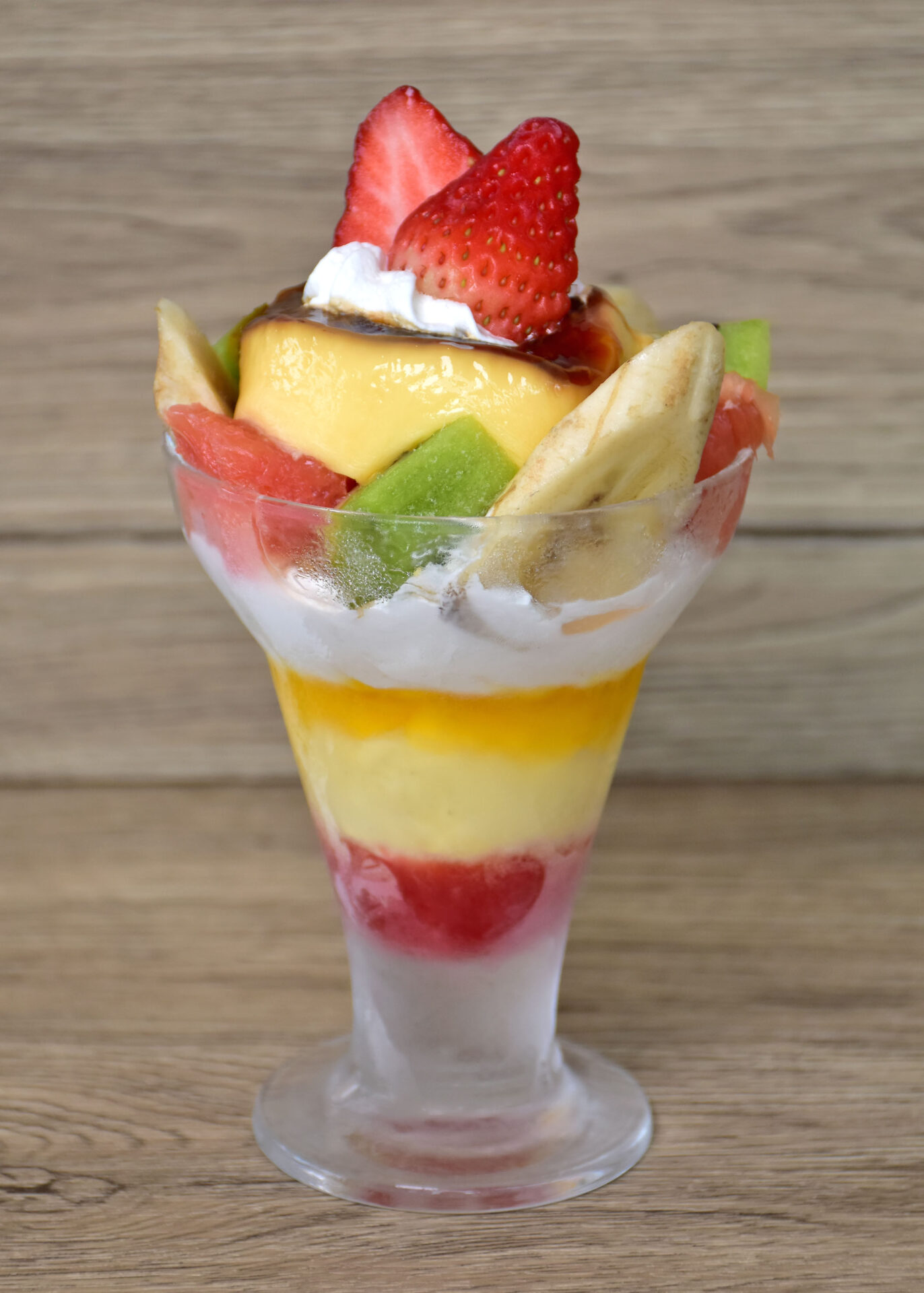 いちご、キウイ、グレープフルーツ、バナナが入った、王道のフルーツプリンパフェです。